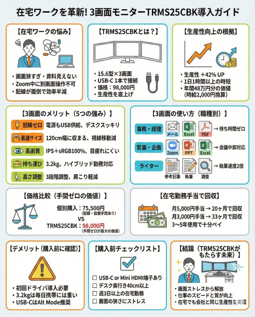 在宅勤務で「画面が足りない💦」と感じていませんか?Excelとメールを同時に開くと画面が狭すぎる、Zoom会議しながら資料を見ると切り替えが面倒…。そんな悩みを解決してくれるのが、サンコーから2025年12月10日に発売された「3画面拡張モニター TRMS25CBK」です。15.6型フルHD画面が3枚も付いて、USB Type-Cケーブル1本で接続完了✨ 価格は98,000円。この記事では、在宅ワーカー目線でメリット・デメリットを徹底解説します!